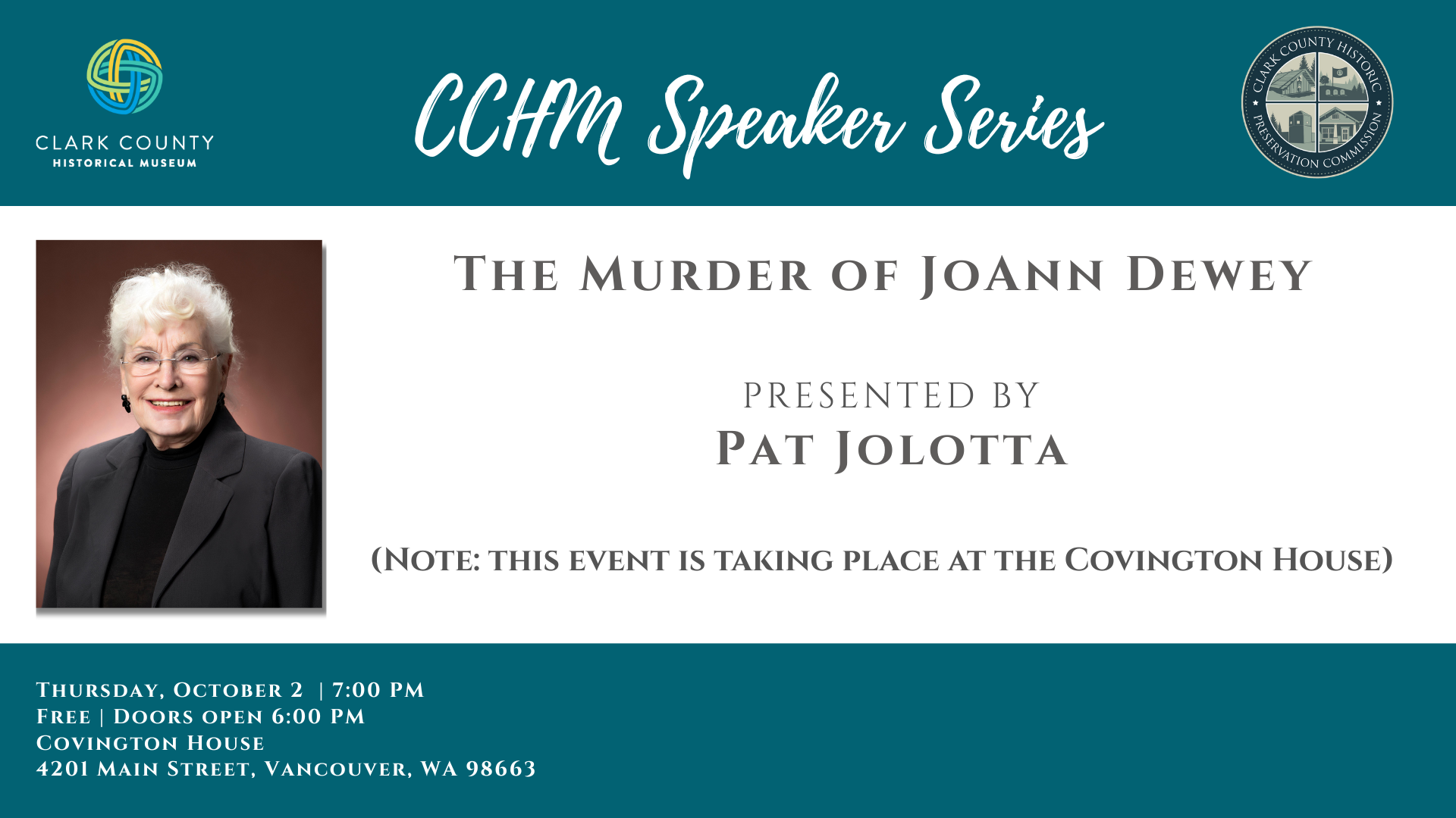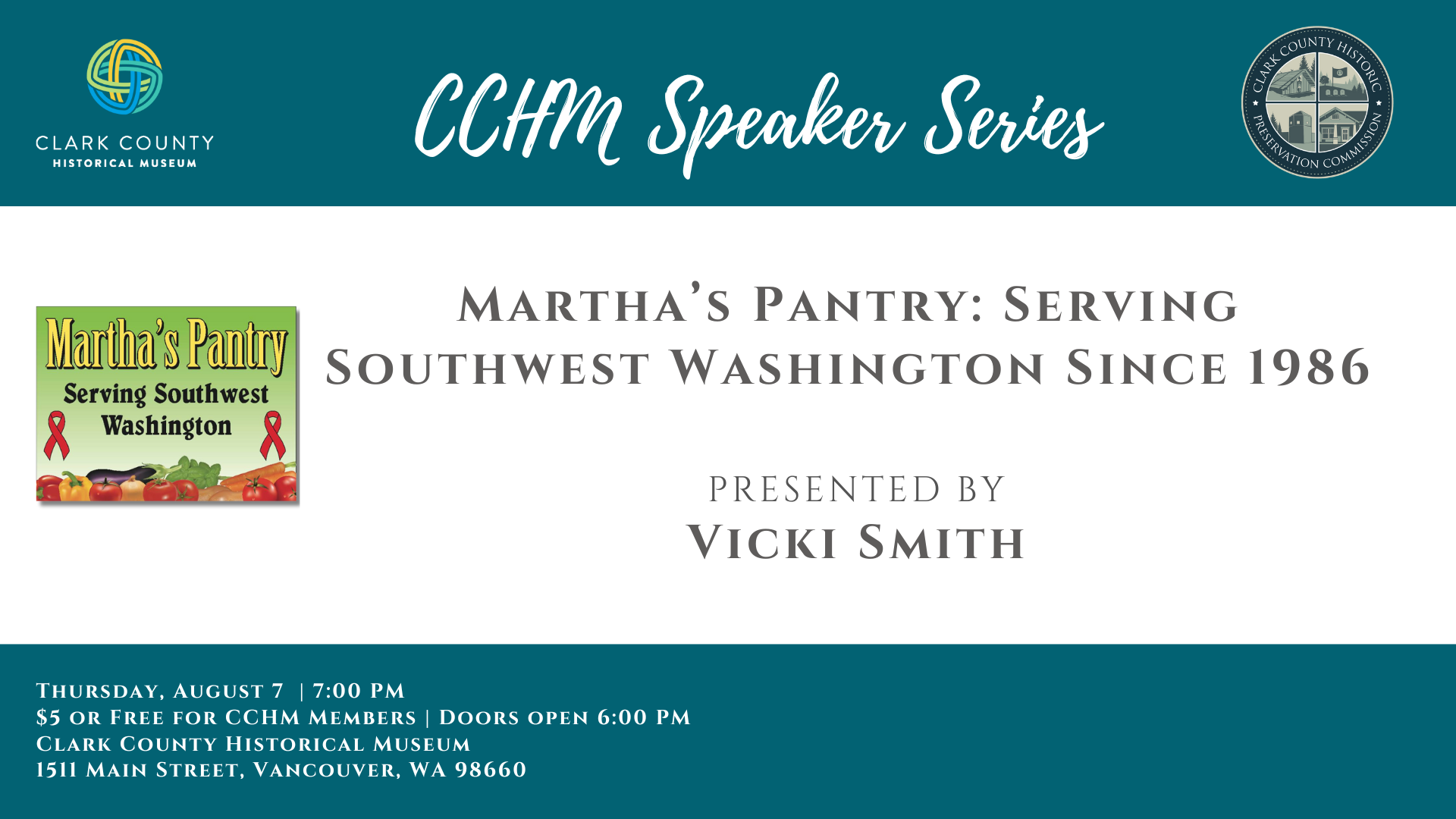 Martha's Pantry: Serving Clark County Since 1986 Thursday, August 7, 2025 Clark County Historical Museum 1511 Main Street, Vancouver, WA 98660 Free for CCHM Members | $5 for Non-Members Doors Open: 6:00 PM Talk Begins: 7:00 PM Join us for an evening with Vicki Smith, retired Air Force Lt. Colonel and longtime Executive Director of […]