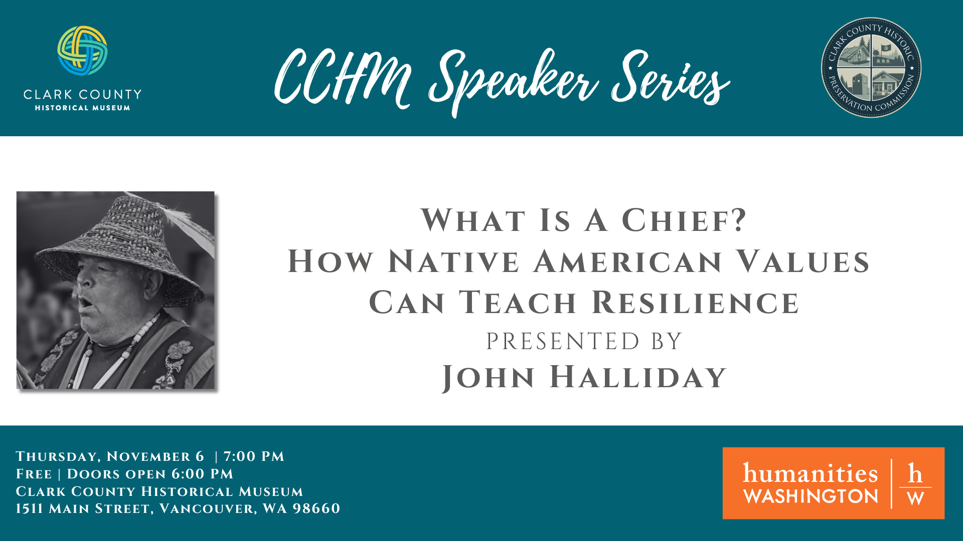 The Clark County Historical Museum (CCHM) concludes its 2025 Speaker Series with “What Is a Chief? How Native Values Can Teach Resilience,” featuring Native artist and former tribal leader John Halliday. The event will take place Thursday, November 6, 2025, at the Clark County Historical Museum (1511 Main Street, Vancouver, WA 98660). Doors open at […]